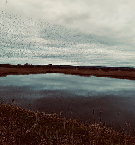 I went back that night at dusk and walked along to Avalon hide, which is much nearer to where the starling groups gather before going into roost. It was immense but also I felt hemmed in because I was watching them from inside a hide. I felt like I wanted to take the roof off so I could see them properly. Then I was annoyed at the trees because they were in the way of all the millions of starlings.